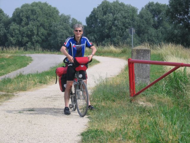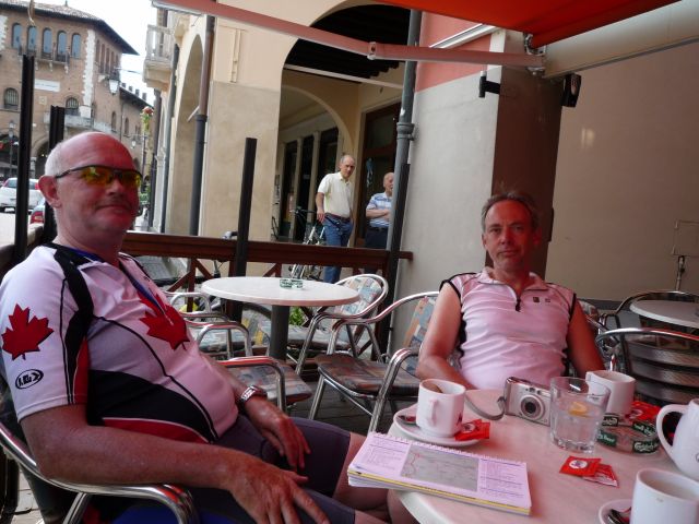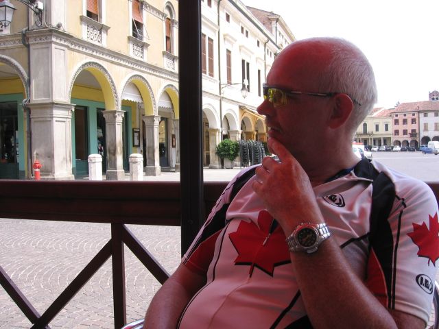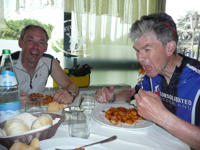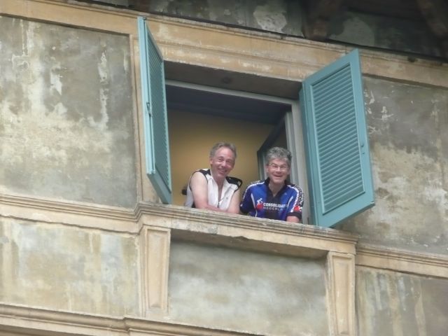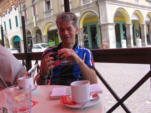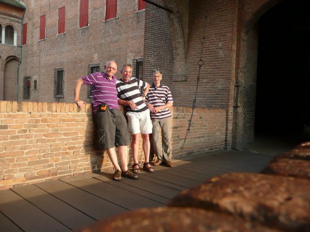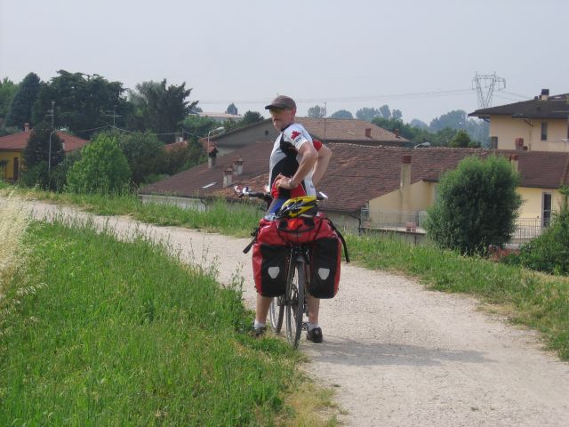 Gisteravond nog even kort meegeluisterd bij het Pink Floyd concert in Verona (vlakbij de jeugdherberg). Vanochtend zijn we na een typisch italiaans ontbijt (bolletje jam en koffie) vertrokken voor de etappe door de Po-vlakte. Het heet niet voor niets vlakte, de hele dag geen bult gezien en oneindig veel landbouwgebied. Net Nederland, behalve de temperatuur (erg warm). Korte koffiepauze in Montagnana doorgereden naar Badia waar we een pastaatje hebben genomen als lunch. Uiteindelijk aan het eind van de middag aangekomen in Ferrara, nog 185 te gaan tot Florence!