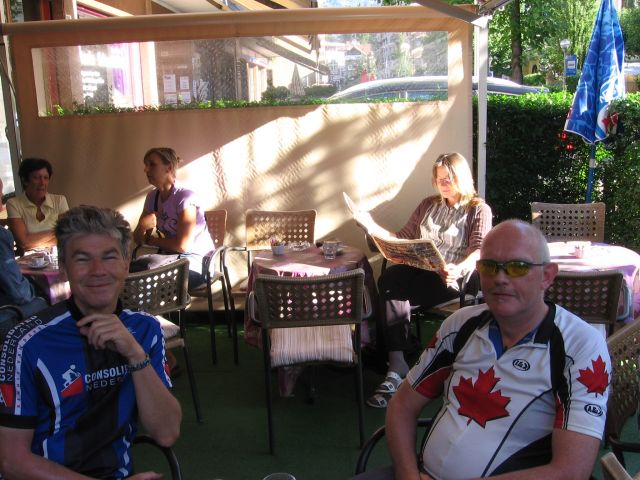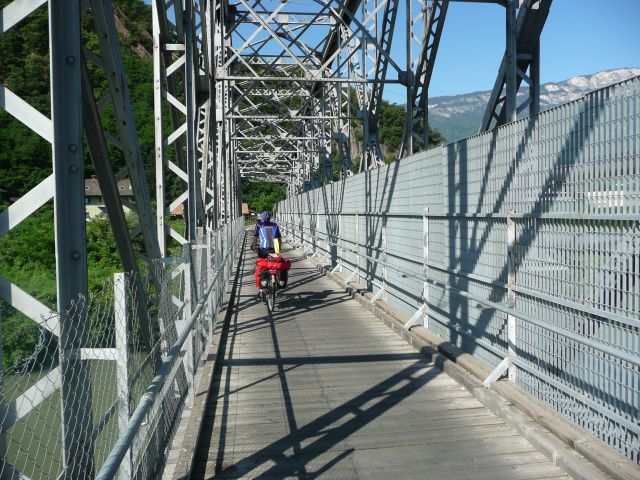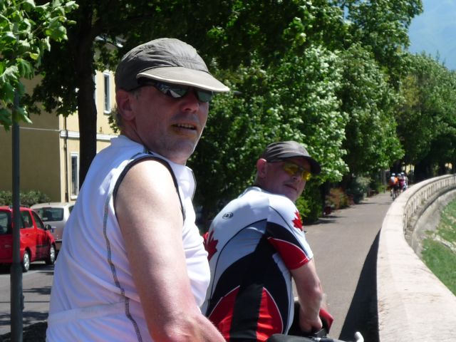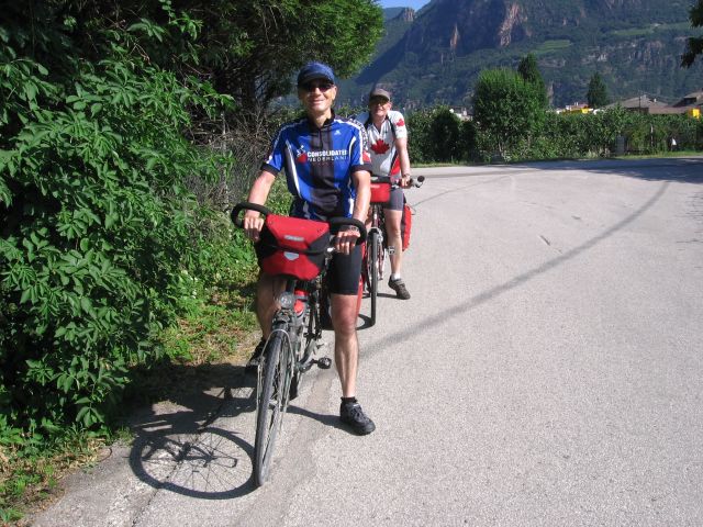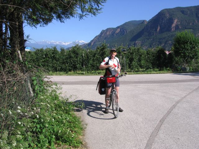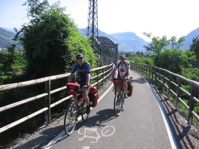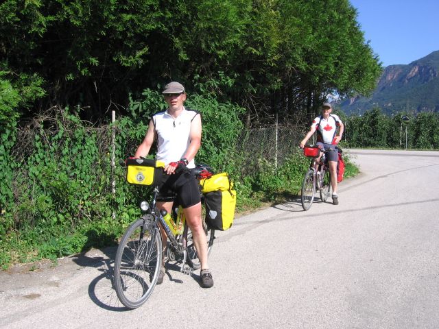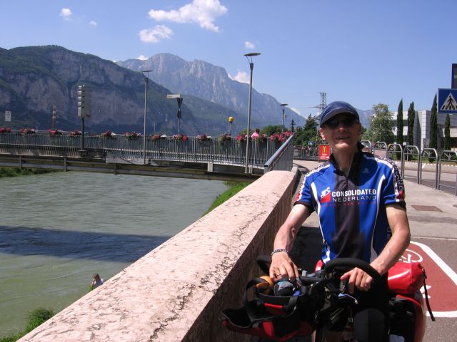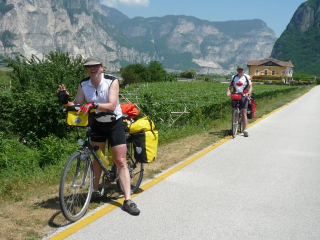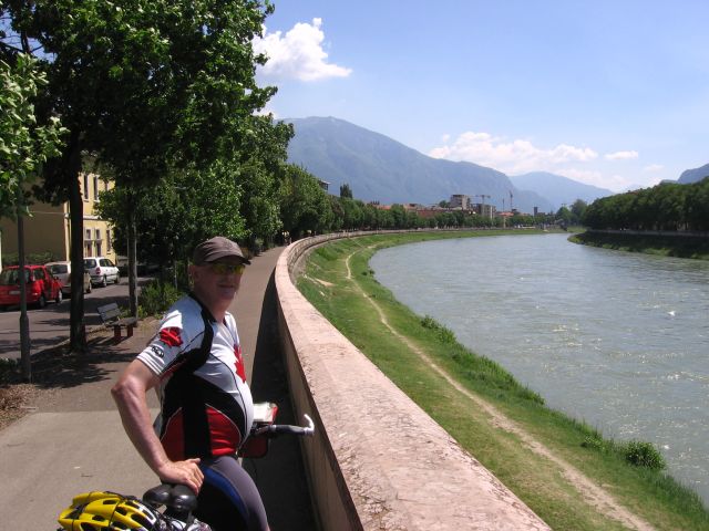 Na een geweldig ontbijt bij ons logeeradres (niet dus), eerst maar een ontbijtje genomen bij de lokale bar. Stelt in Italiƫ niet veel voor, koffie met een zoet, gevuld croissantje. Daarna de route vervolg via het dal van de Adige, met een kleine omweg naar de Kalderer See. Via een prachtig fietspad over een oude spoorweg. Koffie gedronken Tramin en tevens de lunch ingekocht bij de buurtsuper. Deze opgegeten langs de rivier bij Zambana.