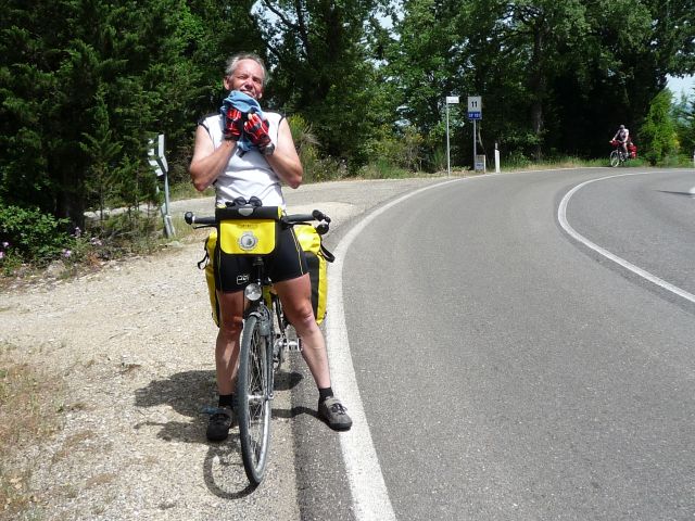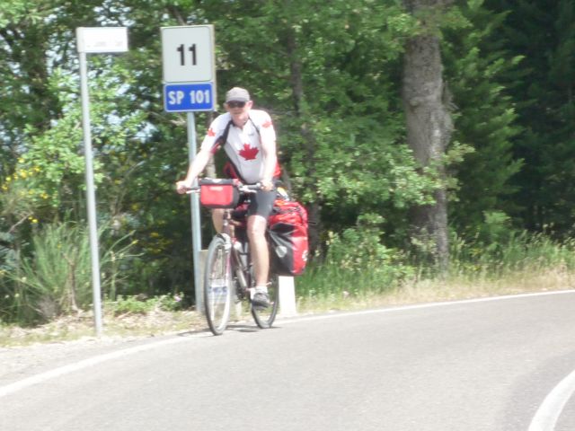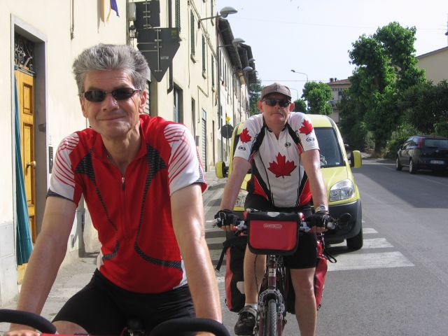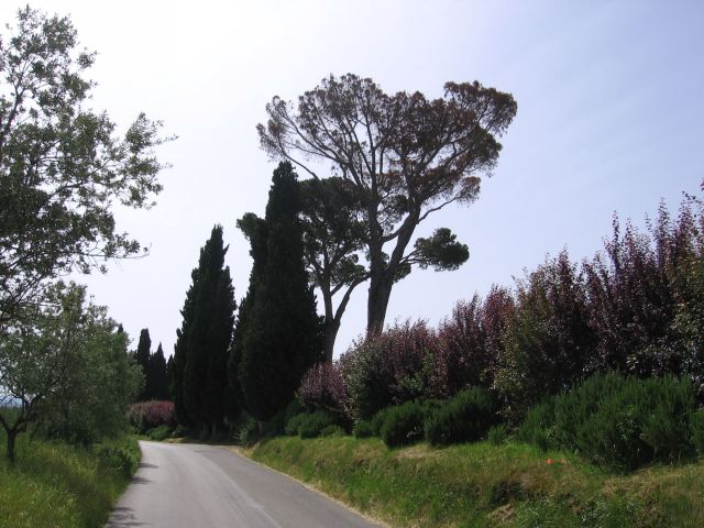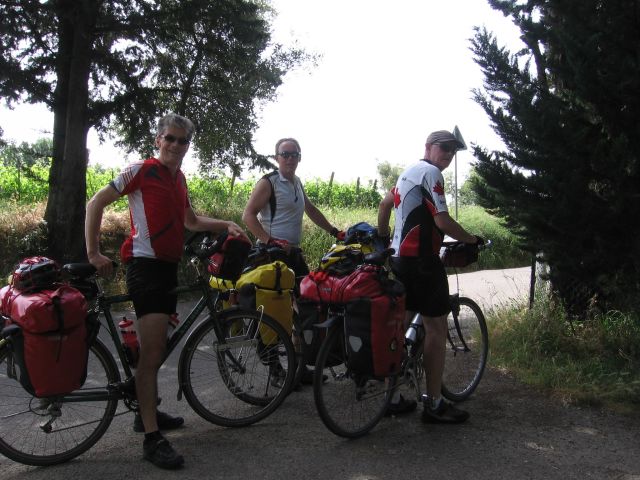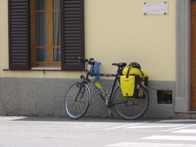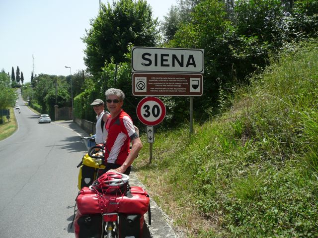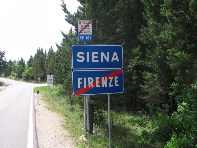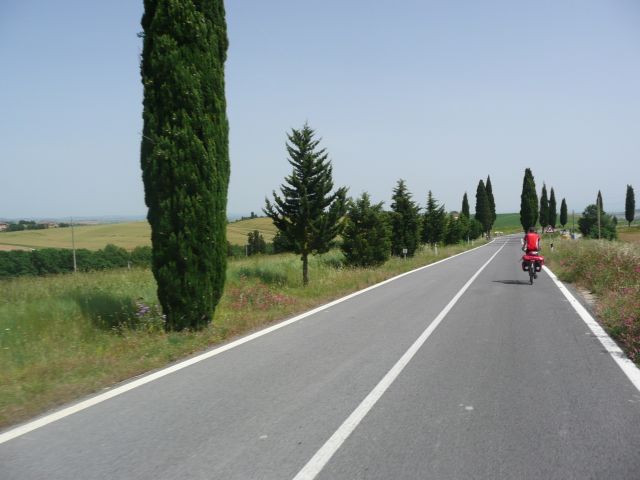 Na de rustdag in Florence vanochtend na het ontbijt vertrokken voor het laatste deel van de tocht, nog bijna 400 km tot Rome. De route loopt vandaag door de Chianti streek. Zon, cypressen, typisch Toscaans landschap. Hoe mooi het landschap ook is, het is een loodzware dag. Erg warm en constant klimmen en dalen. Volgens de routebeschrijving soms '5 km licht klimmen en dalen' terwijl naar ons gevoel dit wel 15 km zwaar klimmen en dalen lijkt. Uiteindelijk geven we de pijp aan Maarten na 109 km zwaar afzien en checken in bij de lokale Albergo. Eric laat de kans niet onbenut om even een duik te nemen in het zwembad (gelukkig de speedo niet voor niets meegenomen). Even eten bij de Pizzeria en na een paar biertjes vermoed ik dat we er vroeg inliggen vanavond. Morgen weer zo'n dag.